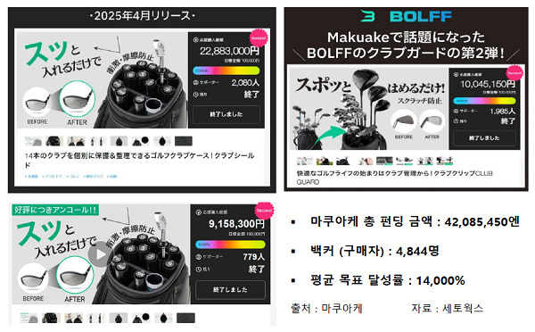 [서울=뉴스핌] 오경진 기자 = 국내 골프용품 전문기업 ㈜아이앤플러스(대표 조성직)의 혁신적인 클럽 보호용품 시리즈가 일본 최대 크라우드펀딩 플랫폼 '마쿠아케(Makuake)'에서, 마쿠아케가 최근 서비스를 시작한 앵콜 펀딩을 활용하여 약 9천여만 원의 추가 펀딩에 성공했다고 밝혔다. 이로써 아이앤플러스는 '클럽 가드'와 '클럽 쉴드' 두 제품 라인업으로 마쿠아케에서 달성한 누적 펀딩액은 4,200만 엔(한화 약 4억 원)을 돌파하게 됐다. 이는 일회성 성공을 넘어 일본 소비자들에게 신뢰받는 브랜드로 확고히 자리 잡았음을 의미한다.